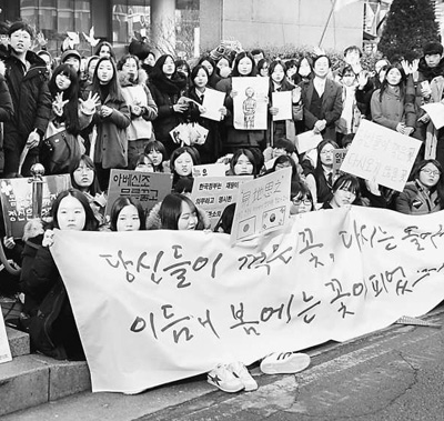 韩国民众聚集在日本驻韩国大使馆门前,要求日本正视历史。(陈尚文摄)