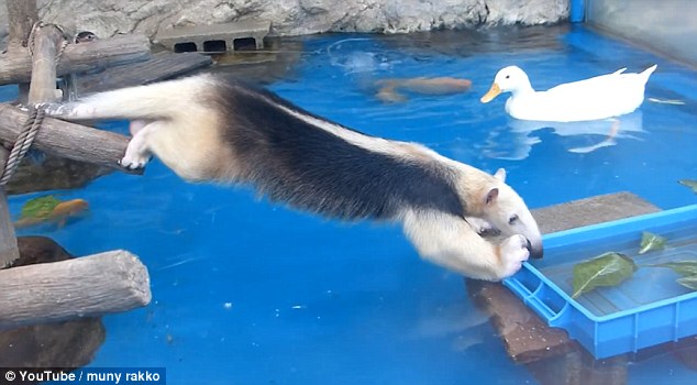 视频里,食蚁兽在发现盛有鸭子饲料的托盘后便开始伸展身体,尝试用自己的爪子抓取食物。经过了一番努力,它成功地前脚着地,顺利品尝起了食物。饱餐一顿后,食蚁兽试图原路返回,却不小心落入了水中。幸运的是,最终它还是爬回了原先位置。