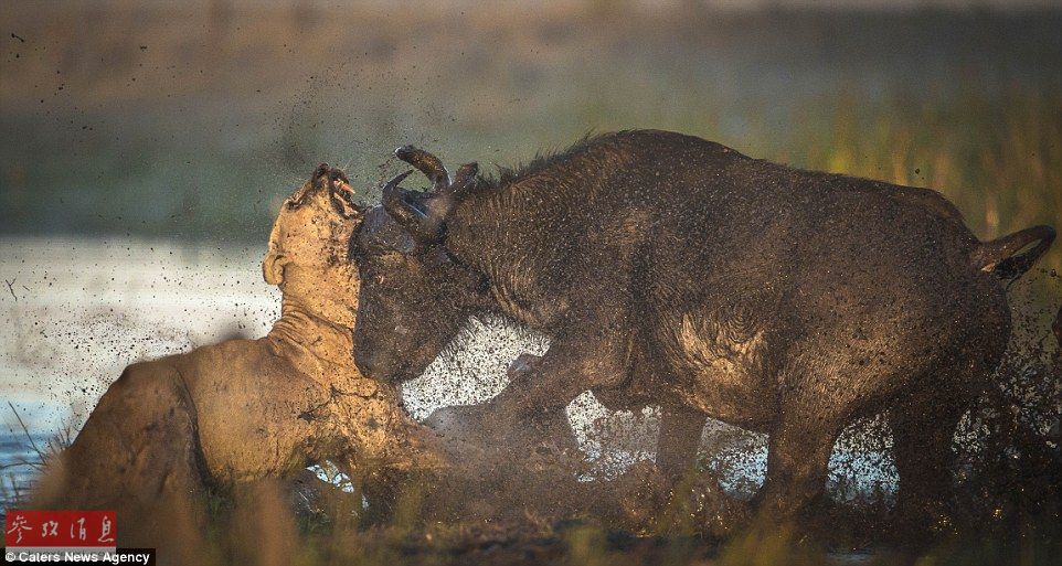 据英国《每日邮报》4月25日报道,在非洲南部的博茨瓦纳草原上,两头狮子对一头小水牛发动攻击,在这危急关头小水牛的妈妈赶来与狮子厮杀,小水牛逃脱的同时水牛妈妈又落入被两头狮子围攻的险境。最后水牛妈妈能否战胜狮子?这整个惊险过程被摄影师Wim van den Heever记录下来。图为水牛妈妈向狮子发起冲击,泥浆四溅。