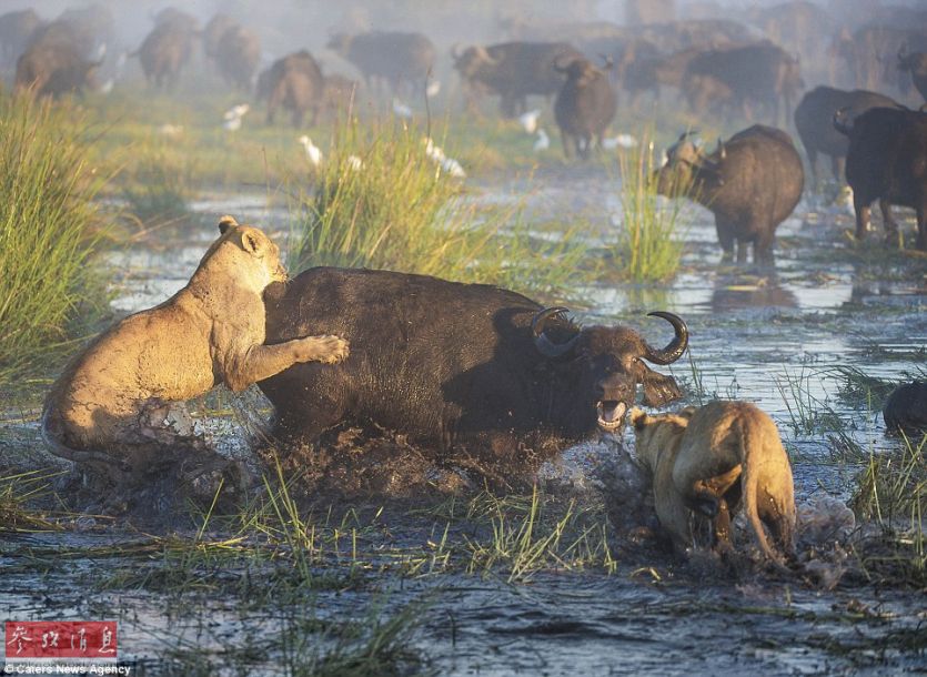 母爱无敌!水牛妈妈为救牛犊勇斗二狮(图)