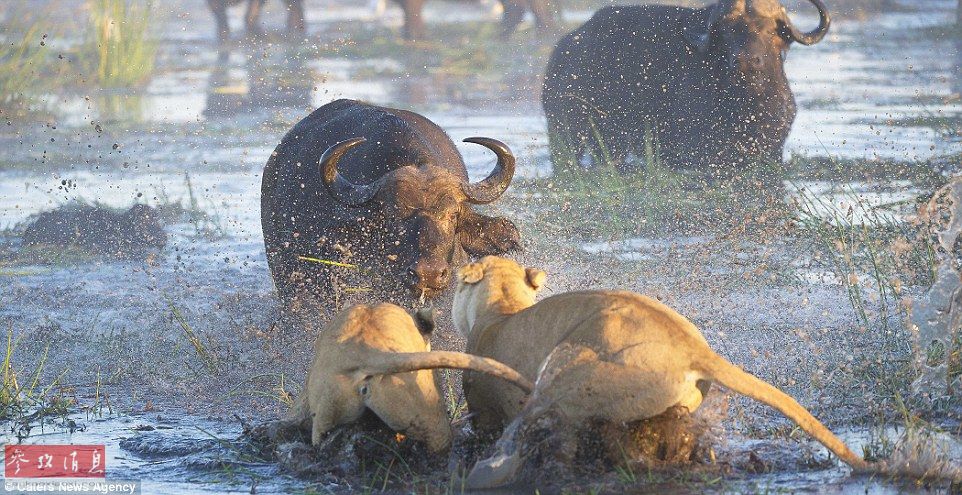 母爱无敌!水牛妈妈为救牛犊勇斗二狮(图)