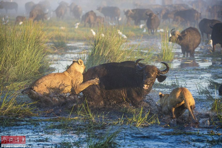 母爱无敌!水牛妈妈为救牛犊勇斗二狮(图)