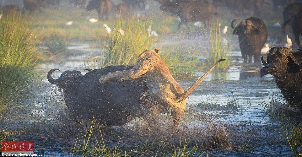 母爱无敌!水牛妈妈为救牛犊勇斗二狮(图)