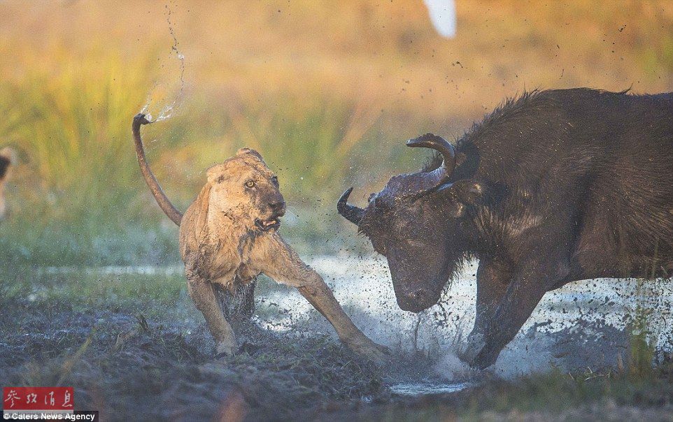 母爱无敌!水牛妈妈为救牛犊勇斗二狮(图)