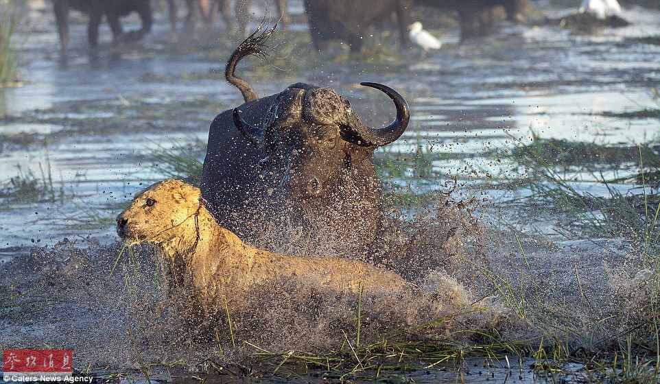 母爱无敌!水牛妈妈为救牛犊勇斗二狮(图)
