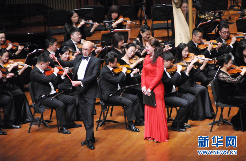 4月25日,《中加之春》音乐会登场国家大剧院,拉开第十六届“相约北京”艺术节的帷幕。图为中国著名歌唱家杨小勇和加拿大女高音歌唱家凯瑟琳·怀特演唱中国歌剧《白毛女》选段“扎红头绳”。新华网记者雷东瑞摄