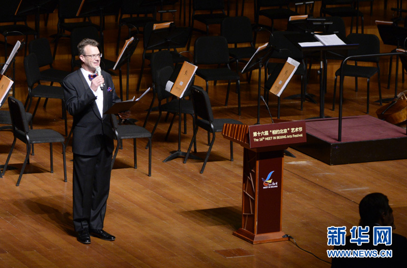 4月25日,《中加之春》音乐会登场国家大剧院,拉开第十六届“相约北京”艺术节的帷幕。图为加拿大籍学者、主持人大山主持音乐会。 新华网记者陈杰摄