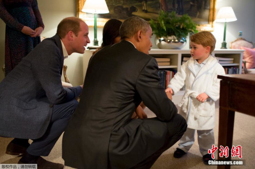 22日,奥巴马夫妇在威廉王子夫妇的带领下,参观了他们的私人寓所。乔治小王子身穿蓝色格纹睡衣、外罩绣有他名字的睡袍,脚上踩着一双有飞机图案的拖鞋,与两位贵客打招呼。这张萌图很快传遍社交网络,不过,刚刚洗完澡的小乔治,似乎对美国总统心不在焉。