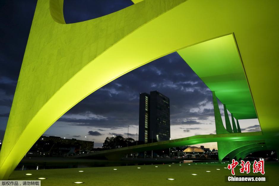 当地时间2016年4月27日,2016年里约奥运会倒计时100天,巴西地标和建筑纷纷亮起象征巴西国旗颜色的黄绿色灯光庆祝。