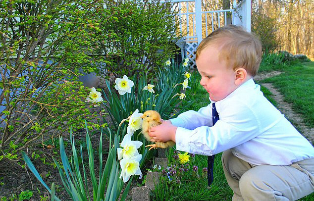 一名小男孩将一只刚出生的小鸡崽凑到水仙花前,好让他的小伙伴也感受一下春天的气息。