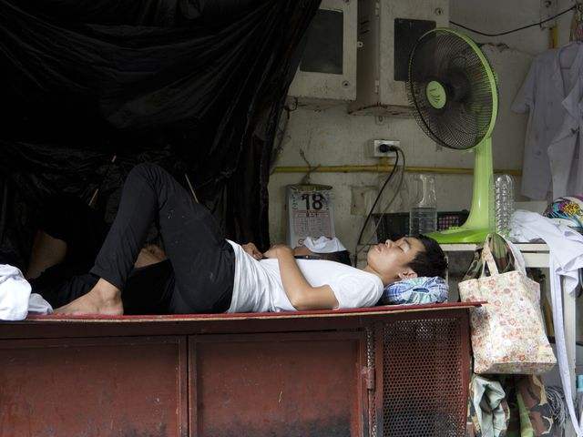 餐馆员工在休息时间开着电风扇纳凉。(图片来源:新华/美联)