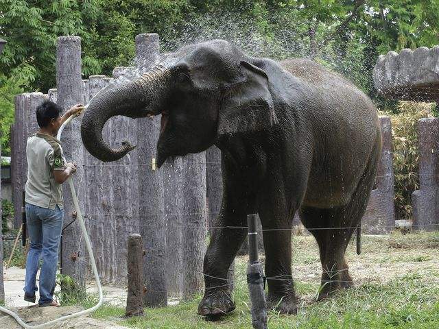 “老虎们吃冰冻肉,我们把猪腿肉和其他大块肉冻起来喂它们。与此同时,我们也注意给老虎身体降温,”绍瓦庞说,“我们给鹿、长颈鹿和大象提供更多阴凉处。洒水车制造的雨喷到地上,降低了这些动物所处馆舍的地面温度。”