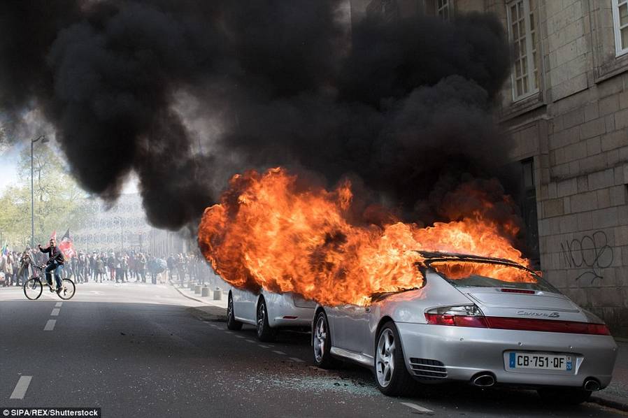 当地时间2016年4月28日,法国反《劳工法》抗议活动演变为暴乱,17万抗议者与防爆警察上演喋血街头。因为法国西部城市南特,愤怒的抗议者点燃一辆保时捷。