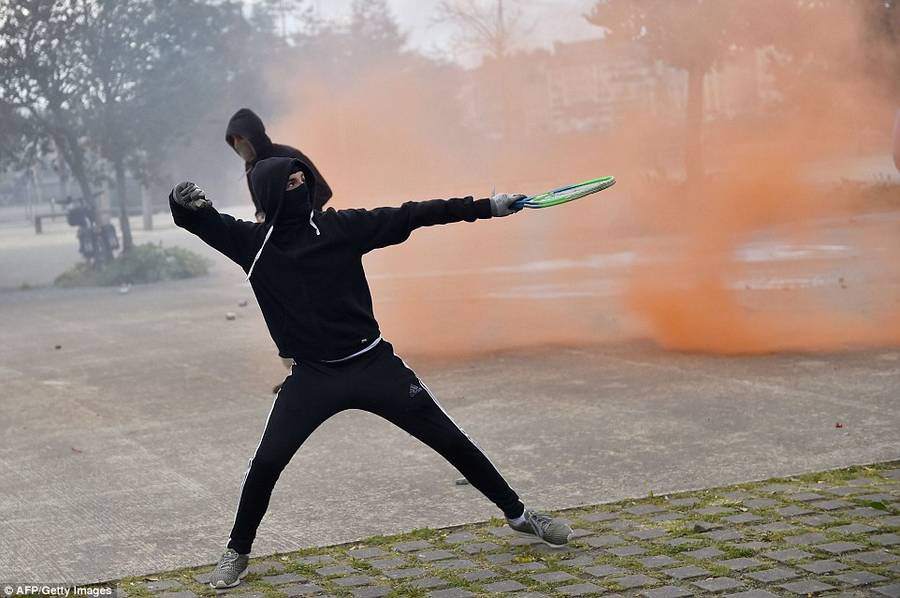 抗议者们指责,法国政府旨在减少长期失业问题的改革举措会侵犯劳工权益,并使年轻人的就业危机进一步恶化。伴随着五一劳动节的临近,法国工会与学生组织计划在本周末发动更大规模的抗议活动。图为法国西部,一个年轻人拿着网球拍向防暴警察投掷石块。