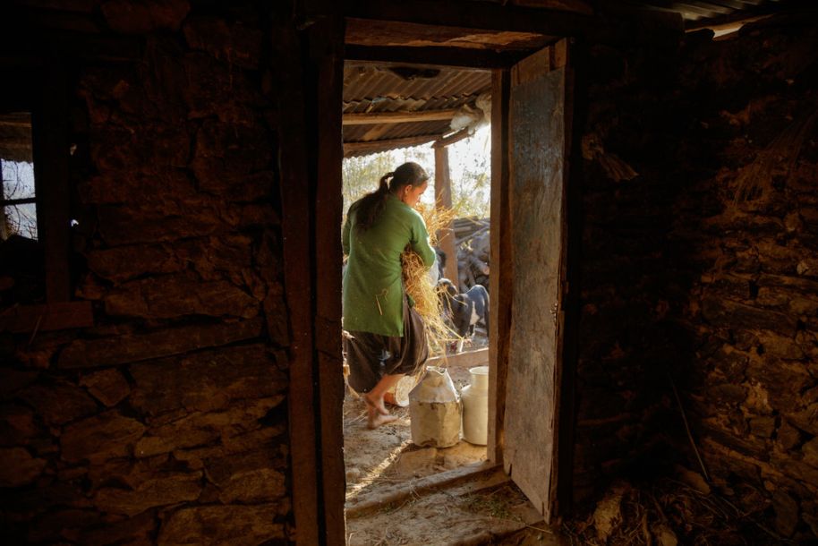尼鲁塔为水牛抓取新的干草。她回忆起年少时刚刚结婚的时候。“开始的是那个月我很不好意思,在他家呆着不太舒服。但我丈夫的妹妹也在家。她说,‘别害怕,我也在。我会帮你。’然后她就教我每件事怎么做。如果没有她,我可能已经走了。”