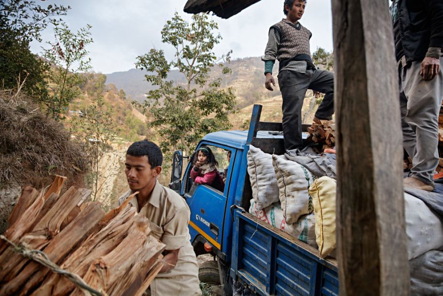在其他村民的帮助下,杜尔加将木材和土豆装到卡车上,他的女儿苏米特拉坐在屋中。他连夜开车到加德满都,在那里把货物批发当地的市场摊贩。