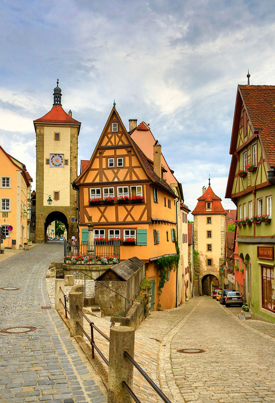 德国罗滕堡——半木结构建筑和狭窄的鹅卵石街道。