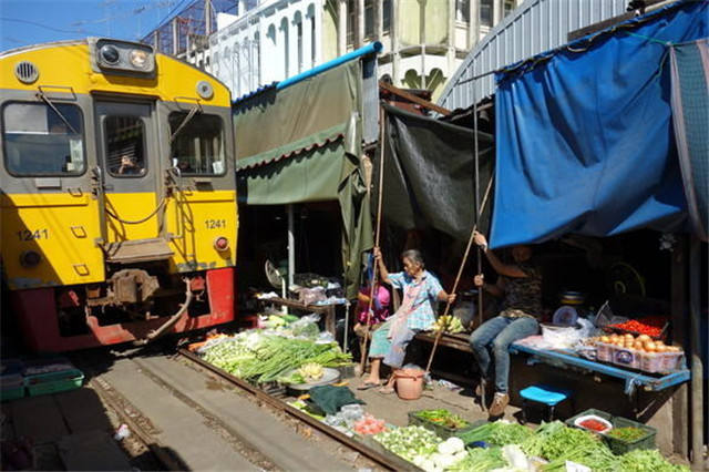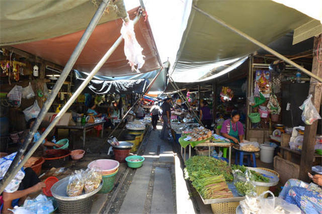 泰国夜功府地狭人稠,甚至连泰国最大新鲜市场之一的一个市场,都是摆设在火车轨道旁,每当火车通过时,还得收拾清理一下,火车才能缓缓穿过。