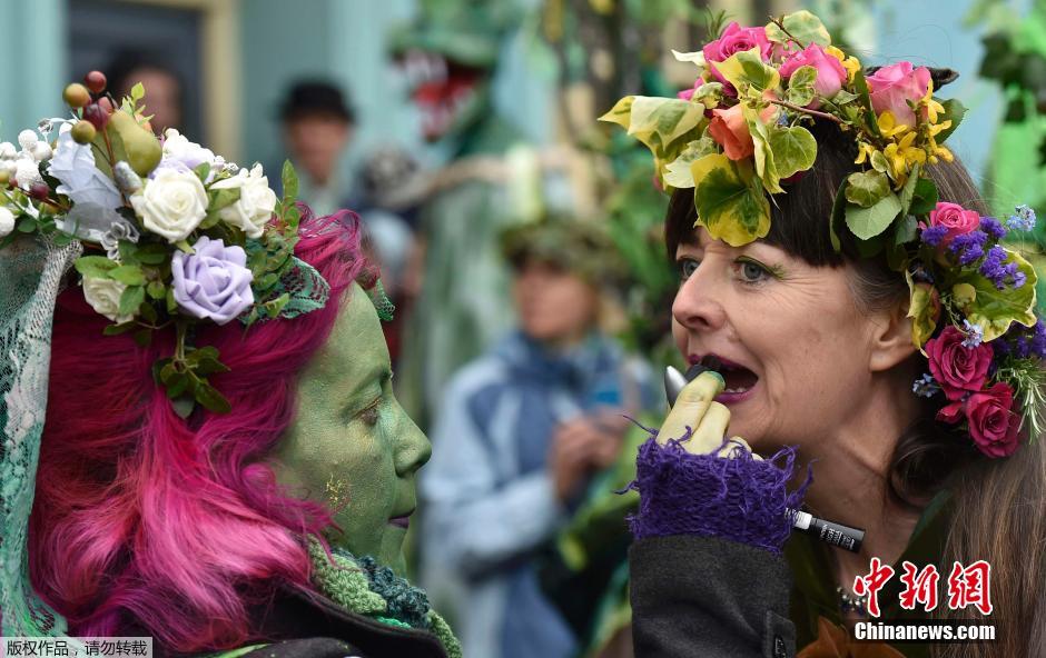 英国庆祝古老节日 民众绿叶花卉裹身盛装游行(组图)