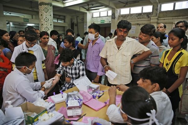 2015年9月17日,印度新德里一家公立医院发烧门诊,人们排队验血。新华社发