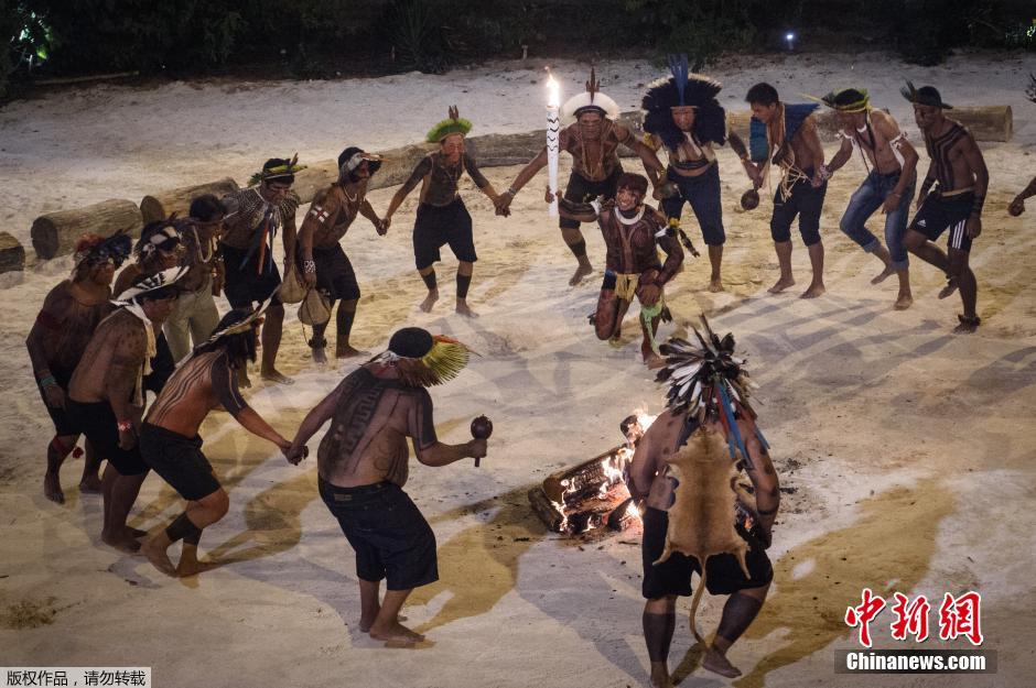 当地时间5月3日,巴西,2016里约奥运会火炬传递,巴西原住民手举奥运火炬举行特色仪式。当天的火炬路线总长118公里,将穿过巴西利亚5个行政区域和多个旅游景点,其中包括国会参众两院、外交部、大教堂、三权广场、部委大道、库比契克大桥、马内加林查国家体育场、巴西利亚国家公园等,传递方式除了跑步接力,还有绳降、游泳、直升机、独木舟等方式,力图全方位展现巴西的魅力。