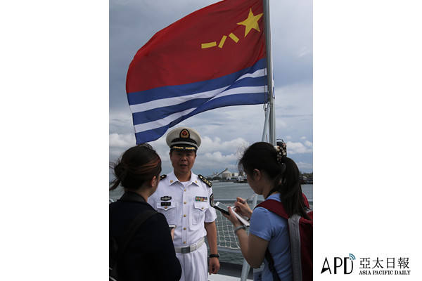 5月3日,“兰州”号导弹驱逐舰舰长唐银川向亚太日报记者介绍兰州舰。亚太日报记者黄海敏摄