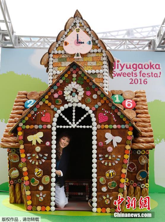 当地时间5月3日,一名女性在“糖果屋”玩耍。这座3米高的“糖果屋”由3000块蛋糕、饼干和糖果等甜品制成,是2016东京自由之丘甜点节中的一处景观。