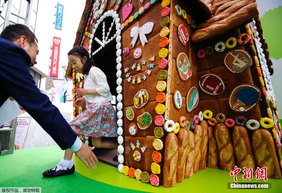 当地时间5月3日,一名小女孩在“糖果屋”玩耍。这座3米高的“糖果屋”由3000块蛋糕、饼干和糖果等甜品制成,是2016东京自由之丘甜点节中的一处景观。