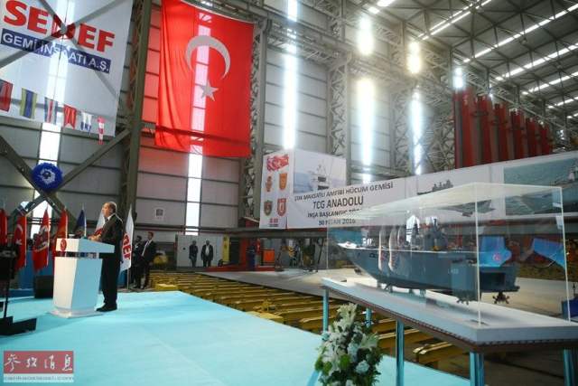 据悉,土耳其塞德夫船厂正建造这艘新型多用途两栖攻击舰,并命名为“阿纳托利亚”号(也有消息称为“阿纳多鲁”号),在2021年完成后,将成为土耳其最新、最先进的水面舰艇。