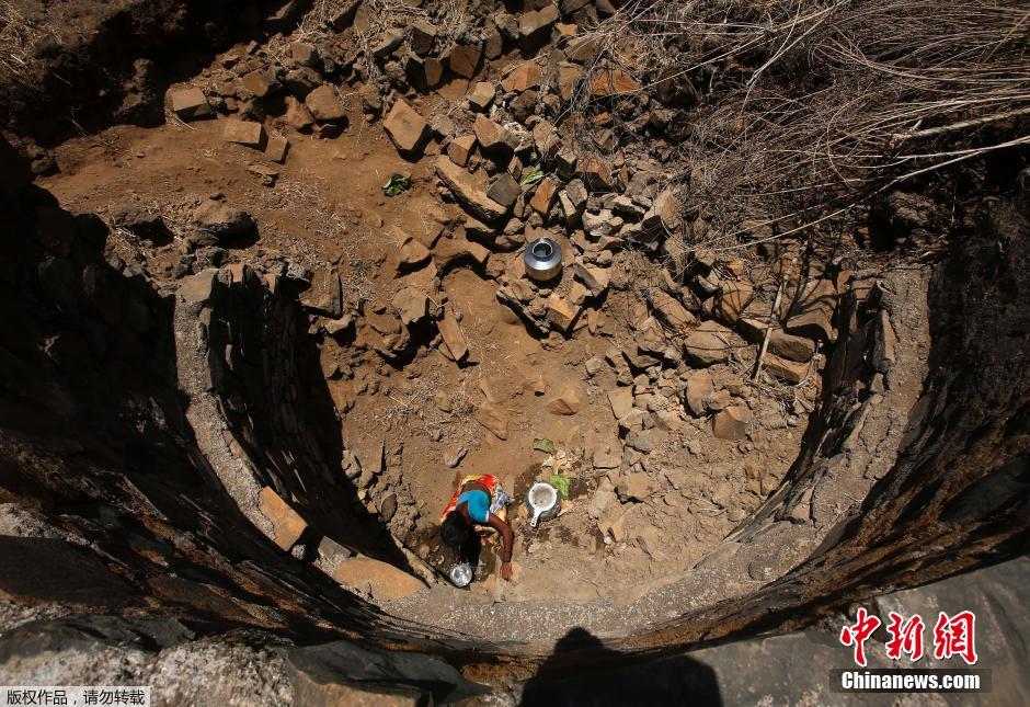 当地时间5月4日,印度,印度持续高温和干旱,导致粮食产量下降,家禽死亡,至少3.3亿印度人没有足够的饮用水,民众从枯井中取水。