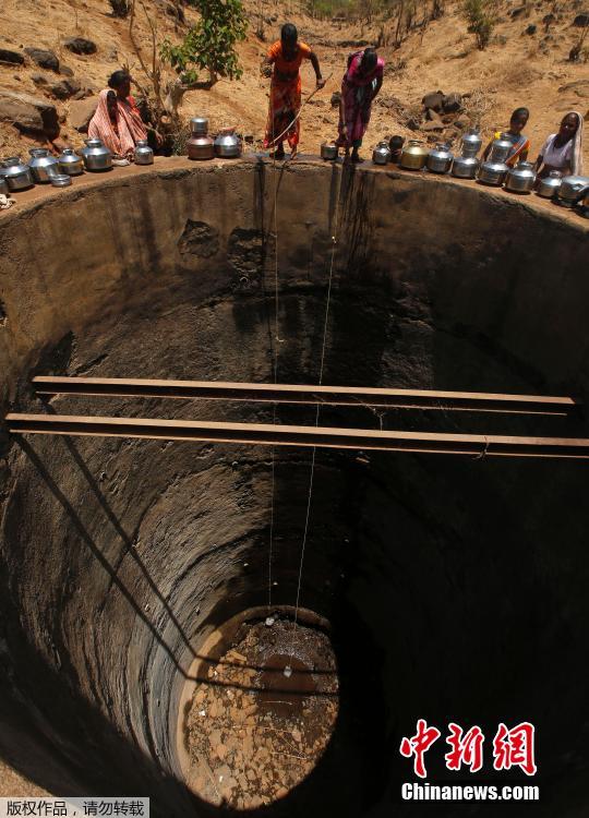当地时间5月4日,印度,印度持续高温和干旱,导致粮食产量下降,家禽死亡,至少3.3亿印度人没有足够的饮用水,民众从枯井中取水。