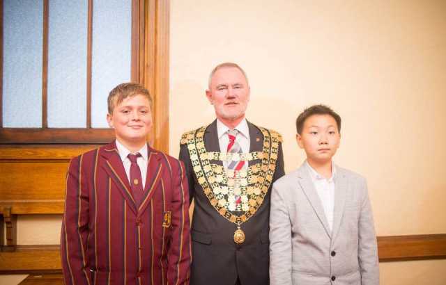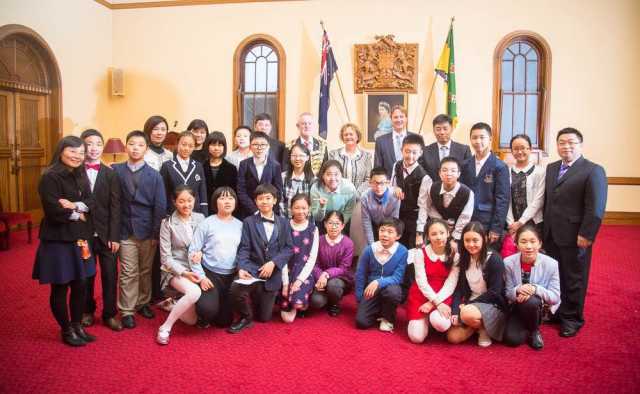 (朗塞斯顿市长同中澳两国学生合影。)