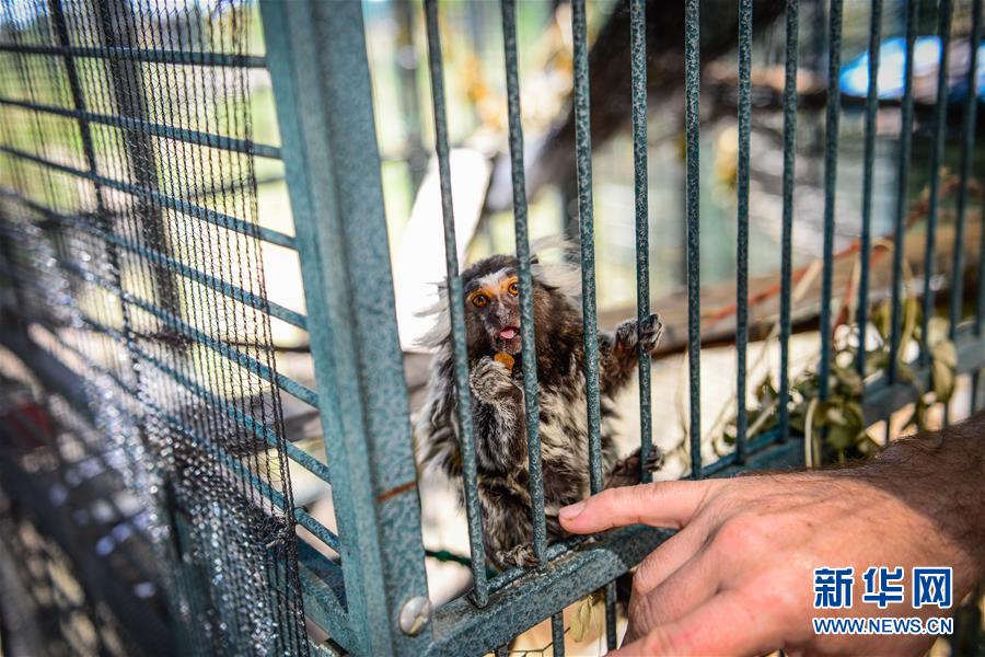 5月5日,一只被解救的普通狨猴在国际灵长类动物援救组织位于南非比勒陀利亚北部的基地吃复合维生素软糖。新华社记者翟健岚摄