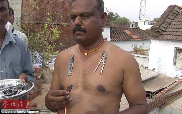 金属物品牢牢吸附在Raikwar的身上,完全不会脱落。