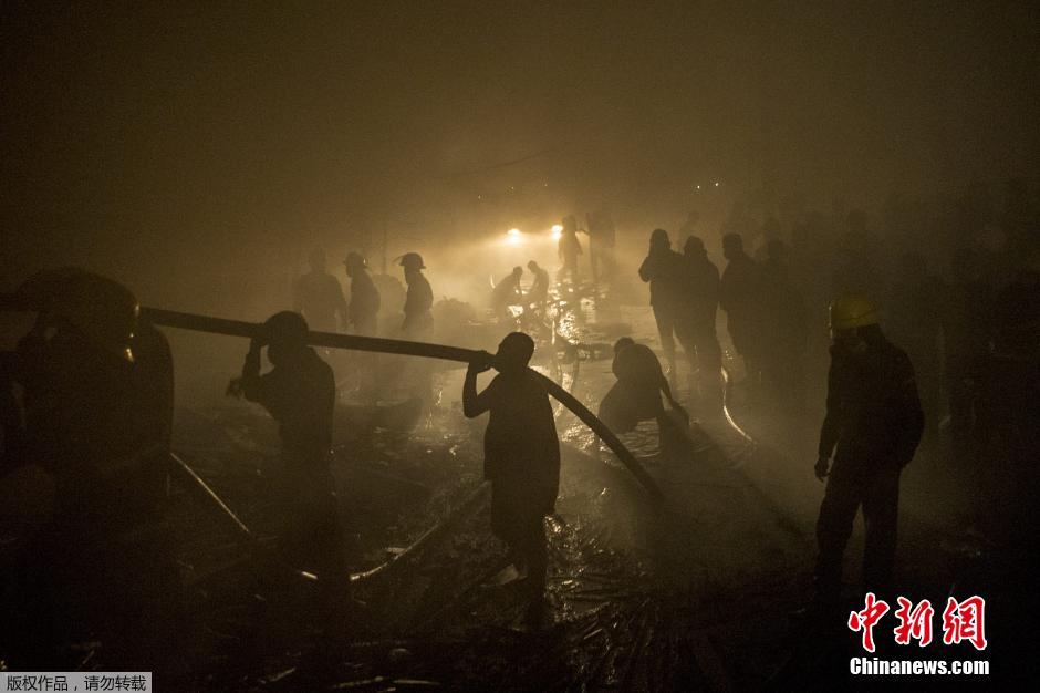 当地时间2016年5月5日,缅甸仰光,一工业区发生火灾,现场浓烟滚滚,消防员全力灭火。