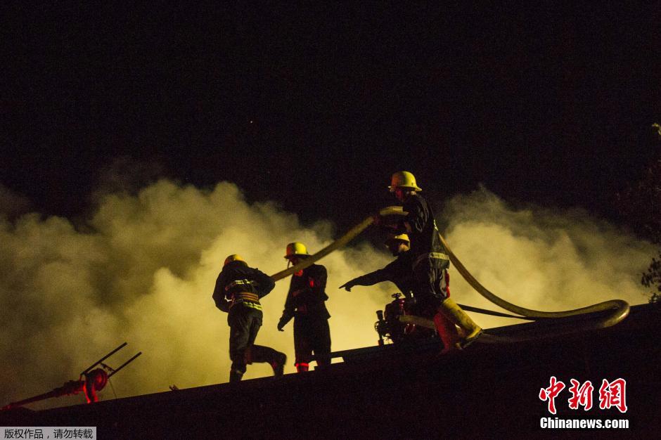 当地时间2016年5月5日,缅甸仰光,一工业区发生火灾,现场浓烟滚滚,消防员全力灭火。