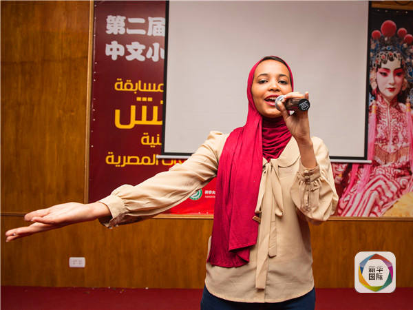 图为玮琪在埃及开罗大学孔子学院戏剧课堂的舞台上练习演讲。(新华社记者孟涛摄)