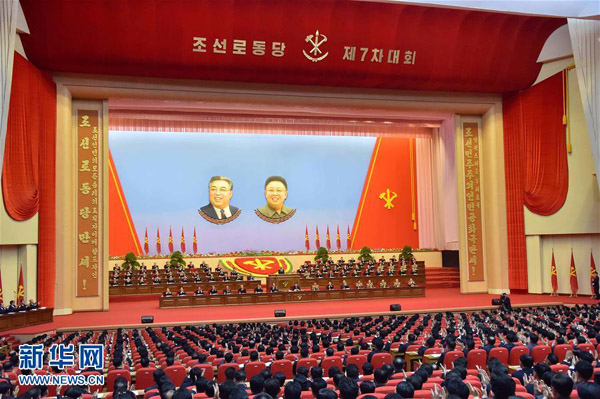 这张朝中社5月7日提供的照片显示的是朝鲜劳动党第七次全国代表大会6日在平壤4·25文化会馆开幕的画面。朝鲜劳动党第七次全国代表大会6日在平壤4·25文化会馆开幕。这是朝鲜劳动党时隔30余年再次召开全国代表大会。朝鲜最高领导人金正恩出席大会并致开幕词。新华社/朝中社