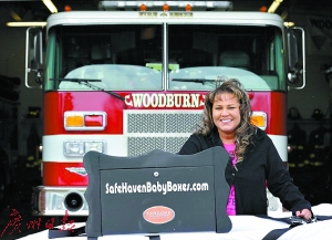当地消防员、“弃婴箱”创办人莫妮卡·凯尔西在消防车前展示弃婴箱。