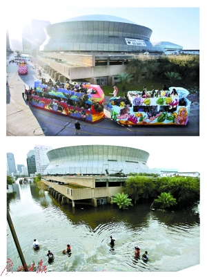 美国新奥尔良风灾一年后与受灾时对比图。上图:受灾一年后,人们在四旬斋前狂欢节上狂欢。下图:风灾刚发生不久,人们从布满洪水的体育场经过。