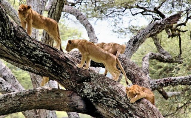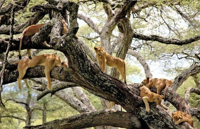 坦桑尼亚公园现奇观 狮子扎堆集体树上小憩(图)