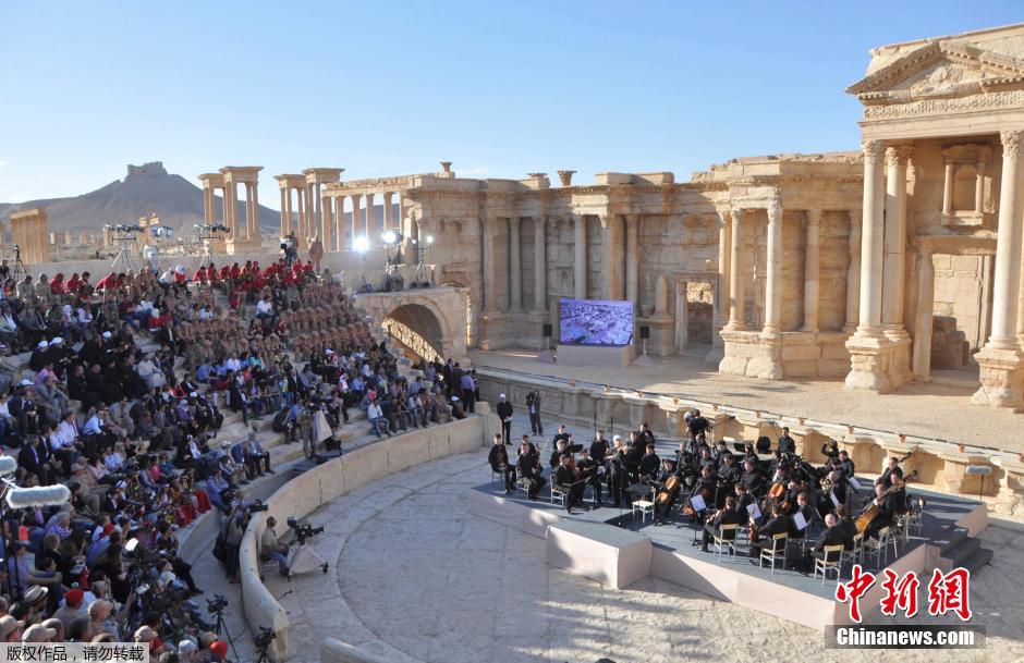 当地时间2016年5月5日,叙利亚帕尔米拉,俄罗斯知名指挥家瓦列里·格尔吉耶夫管理的马林斯基剧院交响乐团在叙利亚帕尔米拉的一处圆形露天剧场举行了一场声势浩大的交响音乐会。俄罗斯总统普京通过视频连线观看。