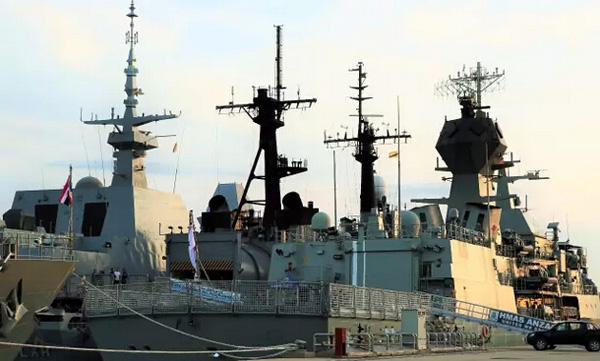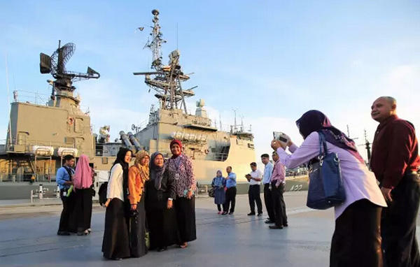 2日傍晚,记者抵达斯里巴加湾市后即刻赶往主要停靠东盟各国军舰的麻拉港口军用码头。令记者颇为意外的是,现场并非想象中那样壁垒森严,岗哨林立,而是一片宽松愉悦的氛围。海上一字排著澳大利亚、泰国及越南等国军舰,舰上尽是舰载导弹、舰炮及密集无线设备。岸上,来自文莱皇家海军的摇滚乐队正在为现场官兵表演,旁边小规模的文莱餐饮美食展正为各国军舰官兵提供各类文莱美食。不远处是带有红色袋鼠标志、暗灰色的澳大利亚军舰,几名军人正在军舰后甲板举行降旗仪式。澳舰硕大舰体完全盖过了紧靠一旁的菲律宾军舰。