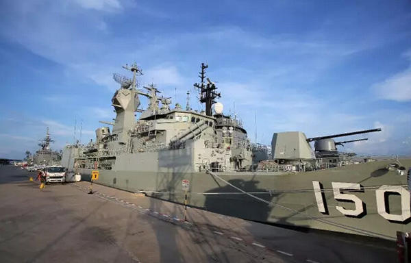 在麻拉军港内,澳大利亚军舰最为醒目,其武器装备也格外引人关注。这次参演的是澳皇家海军150导弹护卫舰“安扎克”号,也是皇家海军最新的八艘主力作战舰艇之一。它为远程多功能护卫舰,担负澳海军防空、反潜、海上监视与侦察和海上封锁等任务。