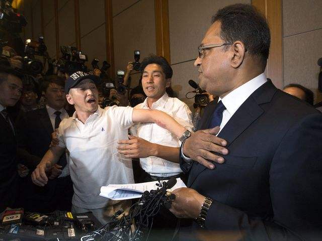 受害者亲属与道歉的利洁时韩国公司负责人发生争执。