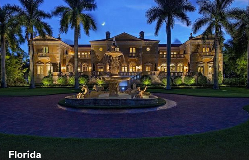 佛罗里达州:该别墅建于海湾地区,面积约1486平方米,5间卧室,8个卫生间,同时配有温泉泳池、车库、长廊等,市价约5990万美元(约人民币3.893亿)。