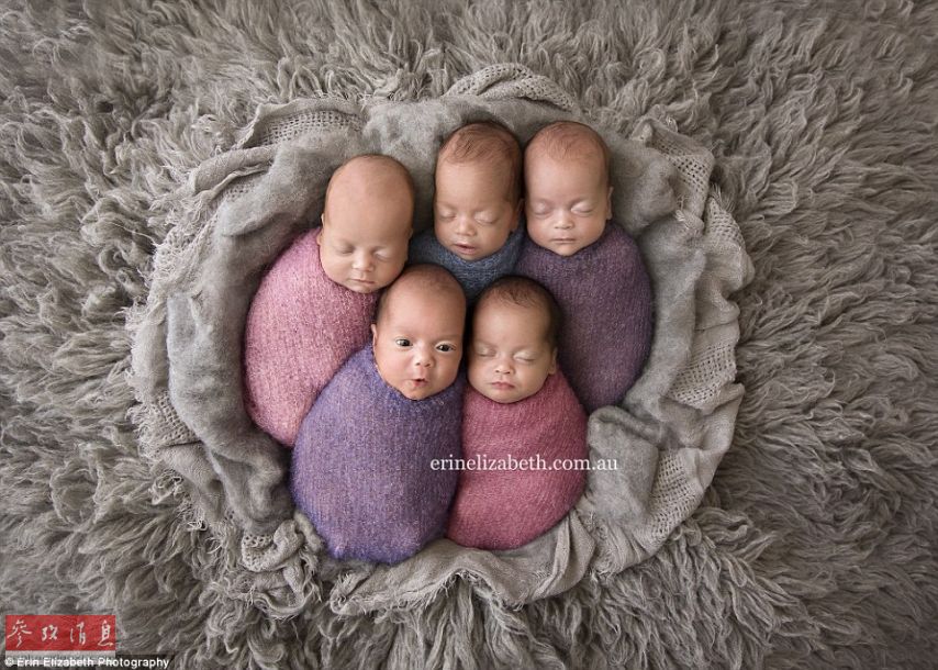 Kim和Vaughn Tucci住在西澳素有“黑天鹅城”之称的珀斯,就在今年1月五个健康的小宝贝出生了,其中一个是儿子Keith,另外四个分别是女儿Ali, Penelope, Tiffany和 Beatrix。