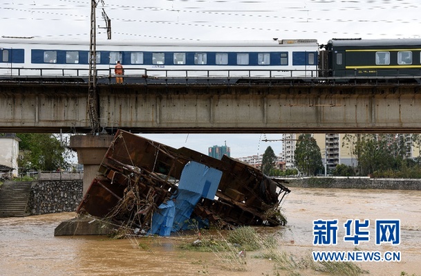 3月23日,列车驶过中国广东韶关乐昌市境内的京广铁路武水桥。南方强降雨持续,多地降雨量突破历史值;入汛提前11天,多条河流水位超出警戒线。厄尔尼诺搅动“风云变幻”持续,给未来气候增添更多不确定性。新华社记者吴涛摄