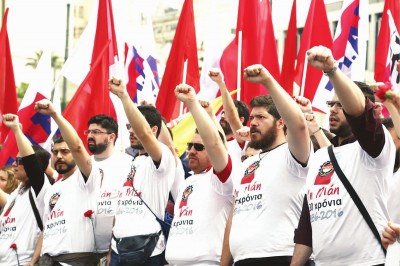 希腊工会对紧缩政策持强烈的反对态度,今年以来几乎所有的旨在抗议紧缩政策的示威游行都系工会组织。希腊工会和政府的迥异立场,让人们几乎忘记,齐普拉斯领导的左派和进步联盟党是一个彻头彻尾的左翼政党,原本应该和工会站在一起。