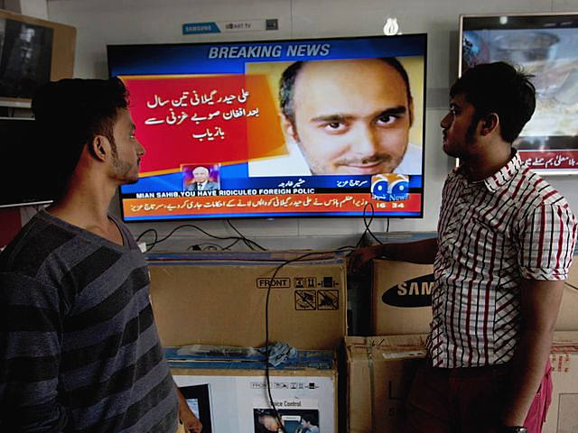 电视播放着吉拉尼儿子获救的新闻。(图片来源:新华/美联)
